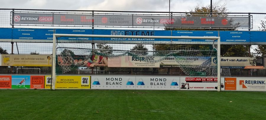 Afgelopen dinsdag zijn er in opdracht van de sponsorcommissie, de Reyrink Groep en Roozen van Hoppe nieuwe reclamedoeken opgehangen in de ballenvangers...