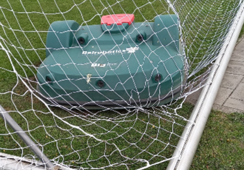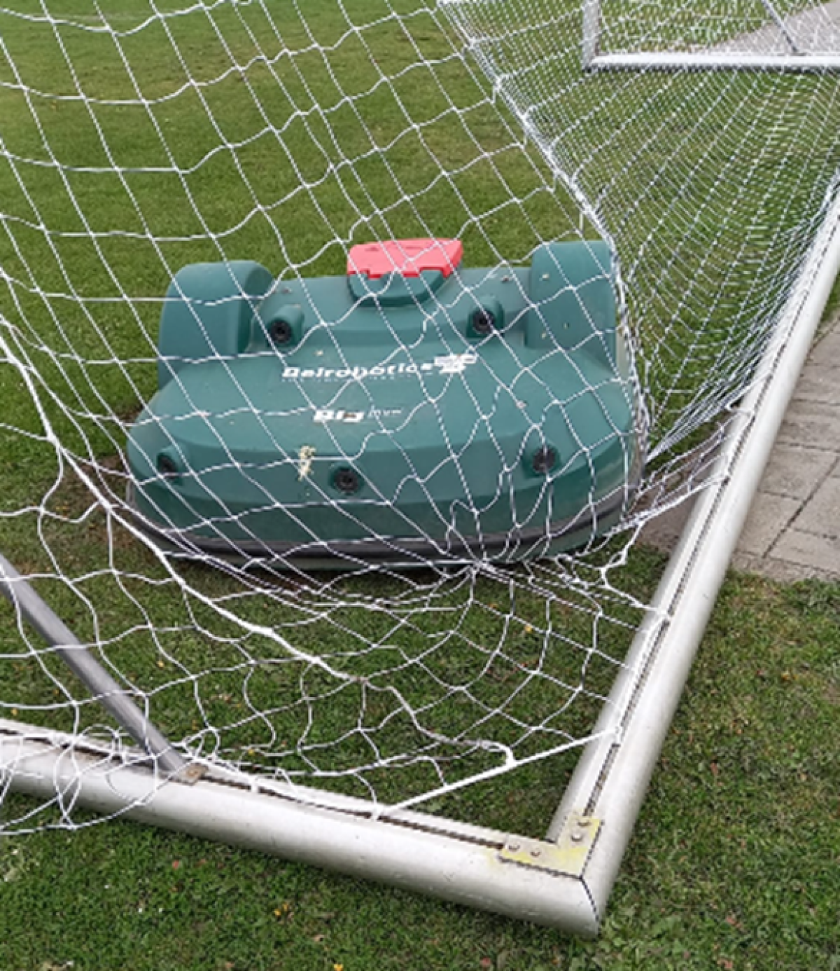 Anderhalve week geleden is de robotmaaier verstrikt geraakt in het voetbalnet (zie eerste foto).
