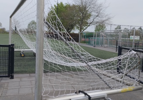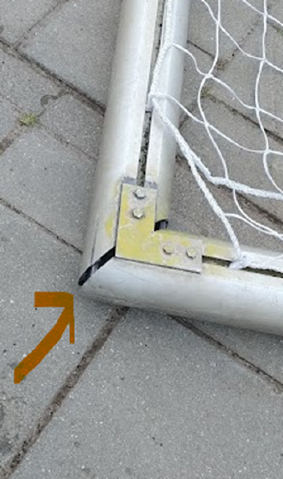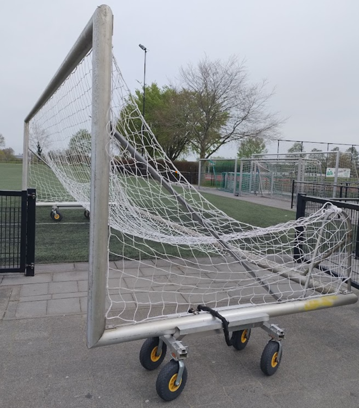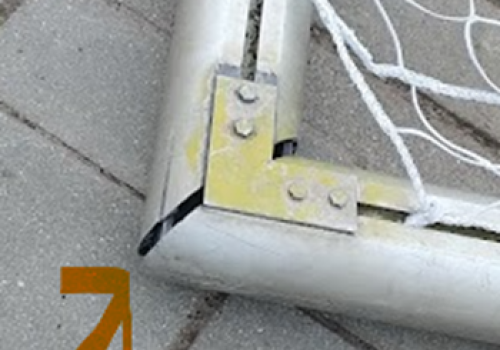 Regelmatig worden de grote goals handmatig door personen versjouwd. Hierdoor kunnen de goals uit het verband raken (zie tweede foto).